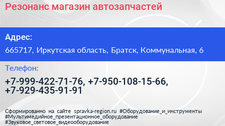 Резонанс, магазин автозапчастей по адресу 665717, Иркутская область, Братск, Коммунальная, 6 в дальнейшем Организация, размещена в следующих категориях: