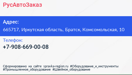 РусАвтоЗаказ по адресу 665717, Иркутская область, Братск, Комсомольская, 10 в дальнейшем Организация, размещена в следующих категориях: