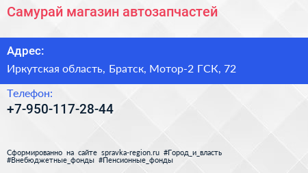 Самурай, магазин автозапчастей по адресу Иркутская область, Братск, Мотор-2 ГСК, 72 в дальнейшем Организация, размещена в следующих категориях: