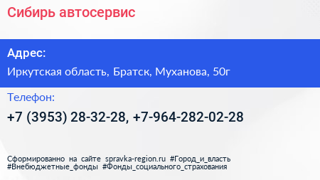Сибирь, автосервис по адресу Иркутская область, Братск, Муханова, 50г в дальнейшем Организация, размещена в следующих категориях: