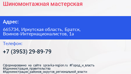 Шиномонтажная мастерская по адресу 665734, Иркутская область, Братск, Воинов-Интернационалистов, 1а в дальнейшем Организация, размещена в следующих категориях: