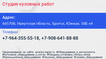 Студия кузовных работ по адресу 665708, Иркутская область, Братск, Южная, 18Б к4 в дальнейшем Организация, размещена в следующих категориях: