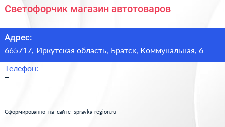 Светофорчик, магазин автотоваров по адресу 665717, Иркутская область, Братск, Коммунальная, 6 в дальнейшем Организация, размещена в следующих категориях: