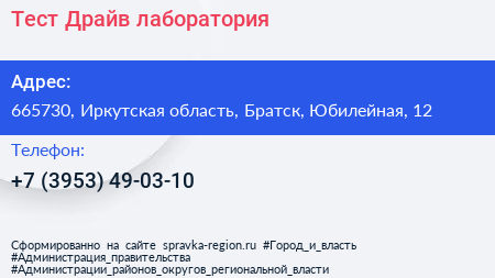 Тест-Драйв, лаборатория по адресу 665730, Иркутская область, Братск, Юбилейная, 12 в дальнейшем Организация, размещена в следующих категориях:
