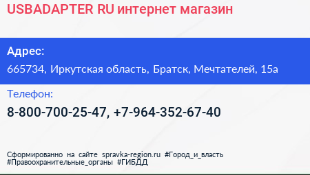 USBADAPTER.RU, интернет-магазин по адресу 665734, Иркутская область, Братск, Мечтателей, 15а в дальнейшем Организация, размещена в следующих категориях: