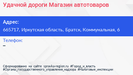 Удачной дороги!, Магазин автотоваров по адресу 665717, Иркутская область, Братск, Коммунальная, 6 в дальнейшем Организация, размещена в следующих категориях: