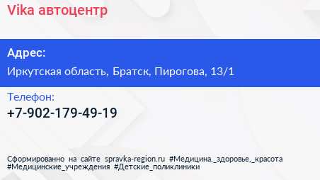 Vika, автоцентр по адресу Иркутская область, Братск, Пирогова, 13/1 в дальнейшем Организация, размещена в следующих категориях: