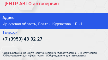 ЦЕНТР АВТО, автосервис по адресу Иркутская область, Братск, Курчатова, 1Б к1 в дальнейшем Организация, размещена в следующих категориях: