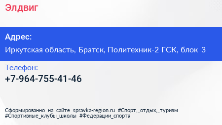 Элдвиг по адресу Иркутская область, Братск, Политехник-2 ГСК, блок 3 в дальнейшем Организация, размещена в следующих категориях: