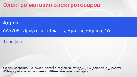 Электро, магазин электротоваров по адресу 665708, Иркутская область, Братск, Кирова, 16 в дальнейшем Организация, размещена в следующих категориях: