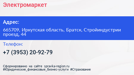 Электромаркет по адресу 665709, Иркутская область, Братск, Стройиндустрии проезд, 44 в дальнейшем Организация, размещена в следующих категориях: