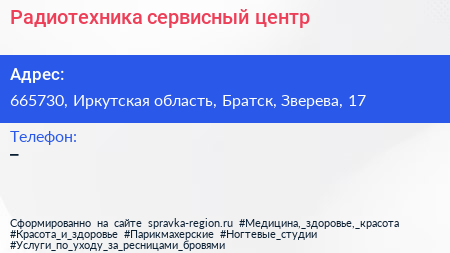 Радиотехника, сервисный центр по адресу 665730, Иркутская область, Братск, Зверева, 17 в дальнейшем Организация, размещена в следующих категориях:
