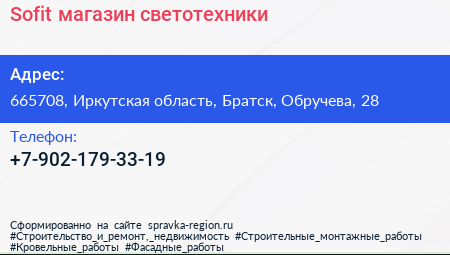 Sofit, магазин светотехники по адресу 665708, Иркутская область, Братск, Обручева, 28 в дальнейшем Организация, размещена в следующих категориях: