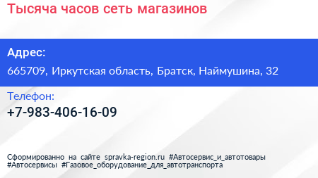 Тысяча часов, сеть магазинов по адресу 665709, Иркутская область, Братск, Наймушина, 32 в дальнейшем Организация, размещена в следующих категориях: