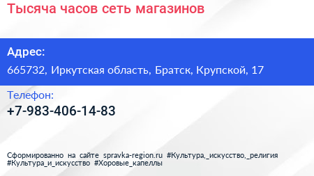 Тысяча часов, сеть магазинов по адресу 665732, Иркутская область, Братск, Крупской, 17 в дальнейшем Организация, размещена в следующих категориях: