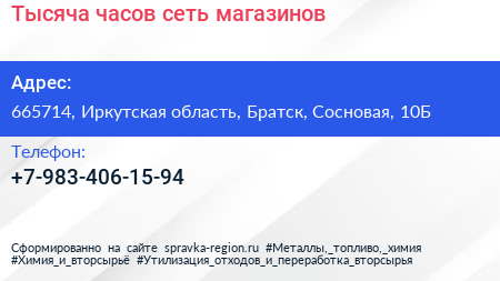 Тысяча часов, сеть магазинов по адресу 665714, Иркутская область, Братск, Сосновая, 10Б в дальнейшем Организация, размещена в следующих категориях:
