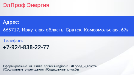 ЭлПроф Энергия по адресу 665717, Иркутская область, Братск, Комсомольская, 67а в дальнейшем Организация, размещена в следующих категориях:
