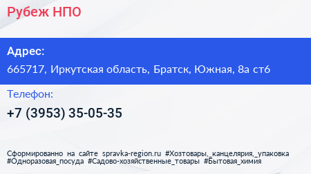 Рубеж НПО по адресу 665717, Иркутская область, Братск, Южная, 8а ст6 в дальнейшем Организация, размещена в следующих категориях: