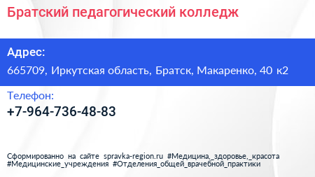 Братский педагогический колледж по адресу 665709, Иркутская область, Братск, Макаренко, 40 к2 в дальнейшем Организация, размещена в следующих категориях:
