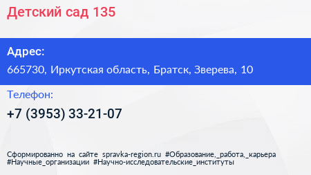 Детский сад №135 по адресу 665730, Иркутская область, Братск, Зверева, 10 в дальнейшем Организация, размещена в следующих категориях: