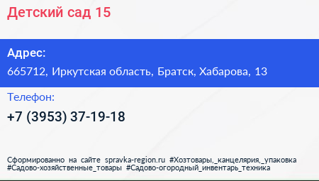 Детский сад №15 по адресу 665712, Иркутская область, Братск, Хабарова, 13 в дальнейшем Организация, размещена в следующих категориях: