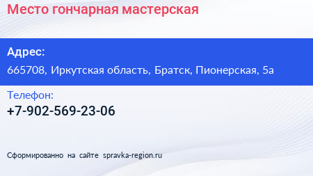 Место, гончарная мастерская по адресу 665708, Иркутская область, Братск, Пионерская, 5а в дальнейшем Организация, размещена в следующих категориях: