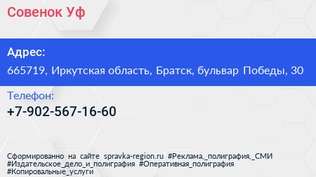 Совенок Уф по адресу 665719, Иркутская область, Братск, бульвар Победы, 30 в дальнейшем Организация, размещена в следующих категориях: