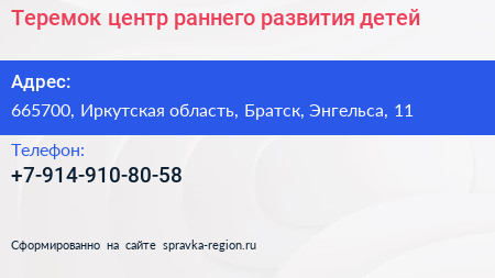 Теремок, центр раннего развития детей по адресу 665700, Иркутская область, Братск, Энгельса, 11 в дальнейшем Организация, размещена в следующих категориях: