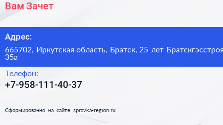 Вам Зачет по адресу 665702, Иркутская область, Братск, 25 лет Братскгэсстроя, 35а в дальнейшем Организация, размещена в следующих категориях: