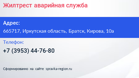 Жилтрест, аварийная служба по адресу 665717, Иркутская область, Братск, Кирова, 10а в дальнейшем Организация, размещена в следующих категориях: