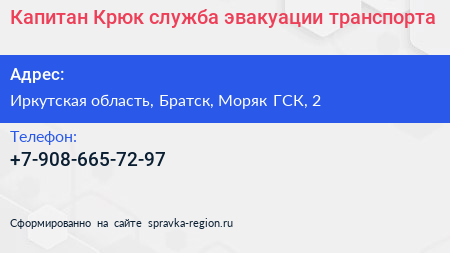 Капитан Крюк, служба эвакуации транспорта по адресу Иркутская область, Братск, Моряк ГСК, 2 в дальнейшем Организация, размещена в следующих категориях: