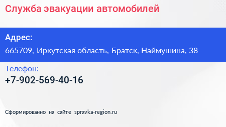 Служба эвакуации автомобилей по адресу 665709, Иркутская область, Братск, Наймушина, 38 в дальнейшем Организация, размещена в следующих категориях: