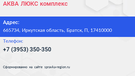 АКВА & ЛЮКС, комплекс по адресу 665734, Иркутская область, Братск, П, 17410000 в дальнейшем Организация, размещена в следующих категориях: