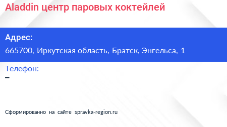 Aladdin, центр паровых коктейлей по адресу 665700, Иркутская область, Братск, Энгельса, 1 в дальнейшем Организация, размещена в следующих категориях:
