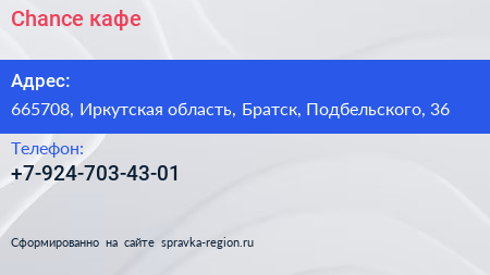 Chance, кафе по адресу 665708, Иркутская область, Братск, Подбельского, 36 в дальнейшем Организация, размещена в следующих категориях: