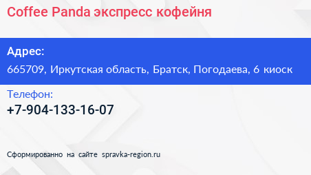 Coffee Panda, экспресс-кофейня по адресу 665709, Иркутская область, Братск, Погодаева, 6 киоск в дальнейшем Организация, размещена в следующих категориях: