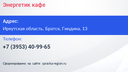 Энергетик, кафе по адресу Иркутская область, Братск, Гиндина, 13 в дальнейшем Организация, размещена в следующих категориях: