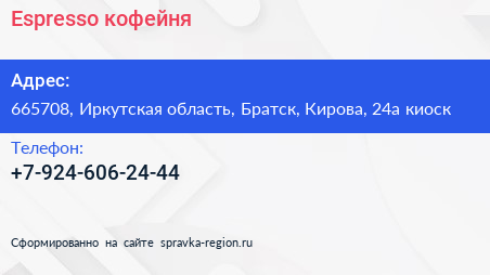 Espresso, кофейня по адресу 665708, Иркутская область, Братск, Кирова, 24а киоск в дальнейшем Организация, размещена в следующих категориях: