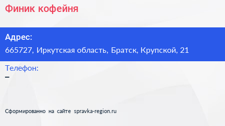 Финик, кофейня по адресу 665727, Иркутская область, Братск, Крупской, 21 в дальнейшем Организация, размещена в следующих категориях: