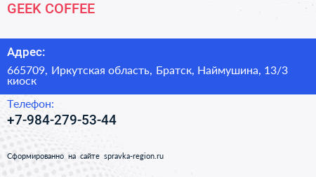 GEEK COFFEE по адресу 665709, Иркутская область, Братск, Наймушина, 13/3 киоск в дальнейшем Организация, размещена в следующих категориях: