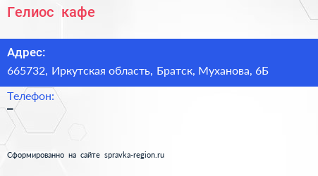 Гелиос+, кафе по адресу 665732, Иркутская область, Братск, Муханова, 6Б в дальнейшем Организация, размещена в следующих категориях: