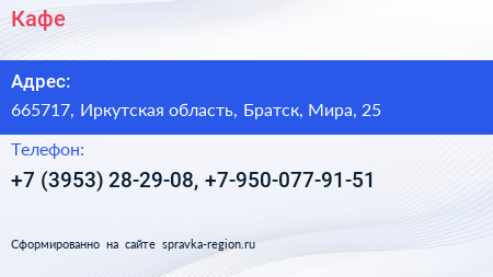Кафе по адресу 665717, Иркутская область, Братск, Мира, 25 в дальнейшем Организация, размещена в следующих категориях: