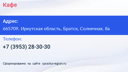 Кафе по адресу 665709, Иркутская область, Братск, Солнечная, 8а в дальнейшем Организация, размещена в следующих категориях: