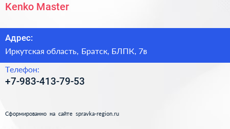 Kenko Master по адресу Иркутская область, Братск, БЛПК, 7в в дальнейшем Организация, размещена в следующих категориях: