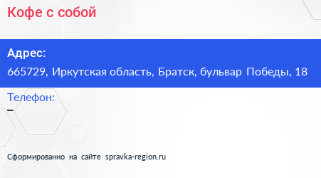 Кофе с собой по адресу 665729, Иркутская область, Братск, бульвар Победы, 18 в дальнейшем Организация, размещена в следующих категориях: