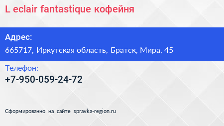 L`eclair fantastique, кофейня по адресу 665717, Иркутская область, Братск, Мира, 45 в дальнейшем Организация, размещена в следующих категориях: