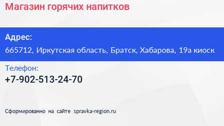 Магазин горячих напитков по адресу 665712, Иркутская область, Братск, Хабарова, 19а киоск в дальнейшем Организация, размещена в следующих категориях: