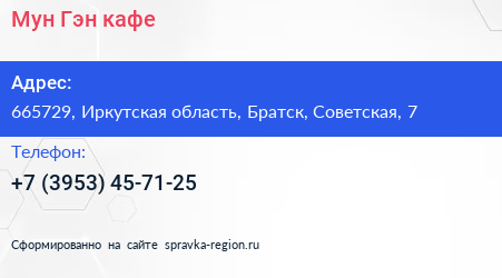 Мун Гэн, кафе по адресу 665729, Иркутская область, Братск, Советская, 7 в дальнейшем Организация, размещена в следующих категориях:
