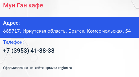 Мун Гэн, кафе по адресу 665717, Иркутская область, Братск, Комсомольская, 54 в дальнейшем Организация, размещена в следующих категориях: