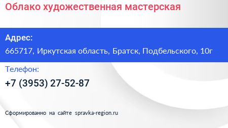Облако, художественная мастерская по адресу 665717, Иркутская область, Братск, Подбельского, 10г в дальнейшем Организация, размещена в следующих категориях:
